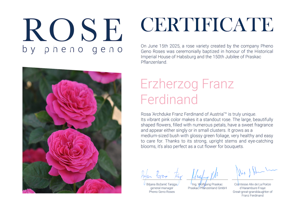Dana 15. juna 2025. godine, sorta ruže koju je stvorila kompanija Pheno Geno Roses svečano je krštena u čast carske porodice Habzburg i 150. jubileja Praskac Pflancenlanda. Ruža Erzherzog Franz Ferdinand od Austrije™ je zaista jedinstvena. Vibrantna ružičasta boja čini je izuzetnom, veoma je zdrava i laka za negu. Veliki, lepo oblikovani cvetovi, ispunjeni su brojnim laticama, imaju sladak miris i pojavljuju se pojedinačno ili u malim grozdovima.